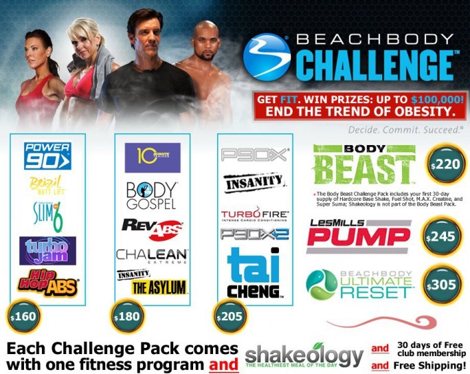 - If you still need to get a workout program, and want to double your results by replacing 1 meal a day with Shakeology, the #1 supplement Beachbody sells, then you have a way to get both at a much reduced rate. This is possible through the “Beachbody Challenge Packs”.